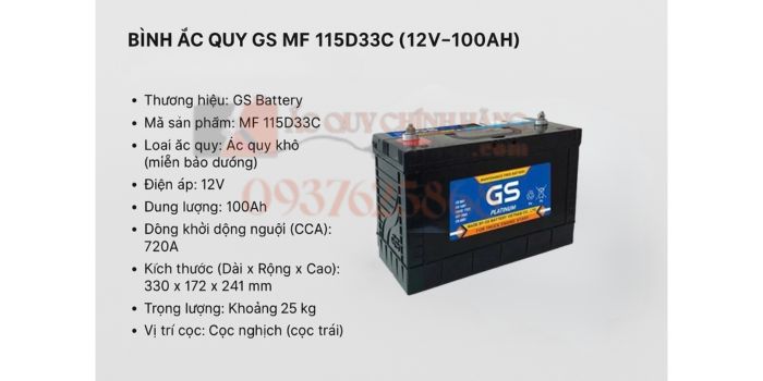 Thông số kỹ thuật chi tiết của bình ắc quy GS MF 115D33C